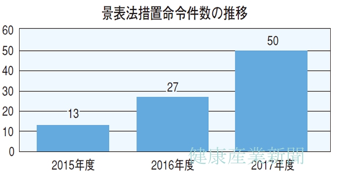 課徴金納付命令は、初年度の16年度は1件だったが、17年度は機能性表示食品を含めて19件に上った。“個人の感想です”など「打消し表示」に対する監視も強めており、6月、景表法上の留意点をまとめ公表している。