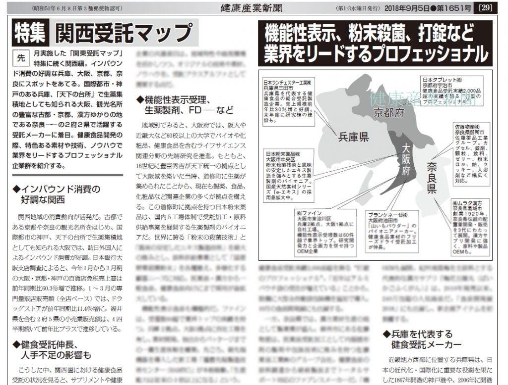 インバウンド消費の好調な兵庫、大阪、京都、奈良にスポットをあてる。国際都市・神戸のある兵庫、「天下の台所」で生薬集積地としても知られる大阪、観光名所の豊富な古都・京都、漢方ゆかりの地である奈良―― の2府2県で活躍する受託メーカーに着目。健康食品開発の際、特色ある素材や技術、ノウハウで業界をリードするプロフェッショナル企業群を紹介する。