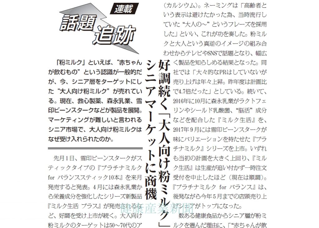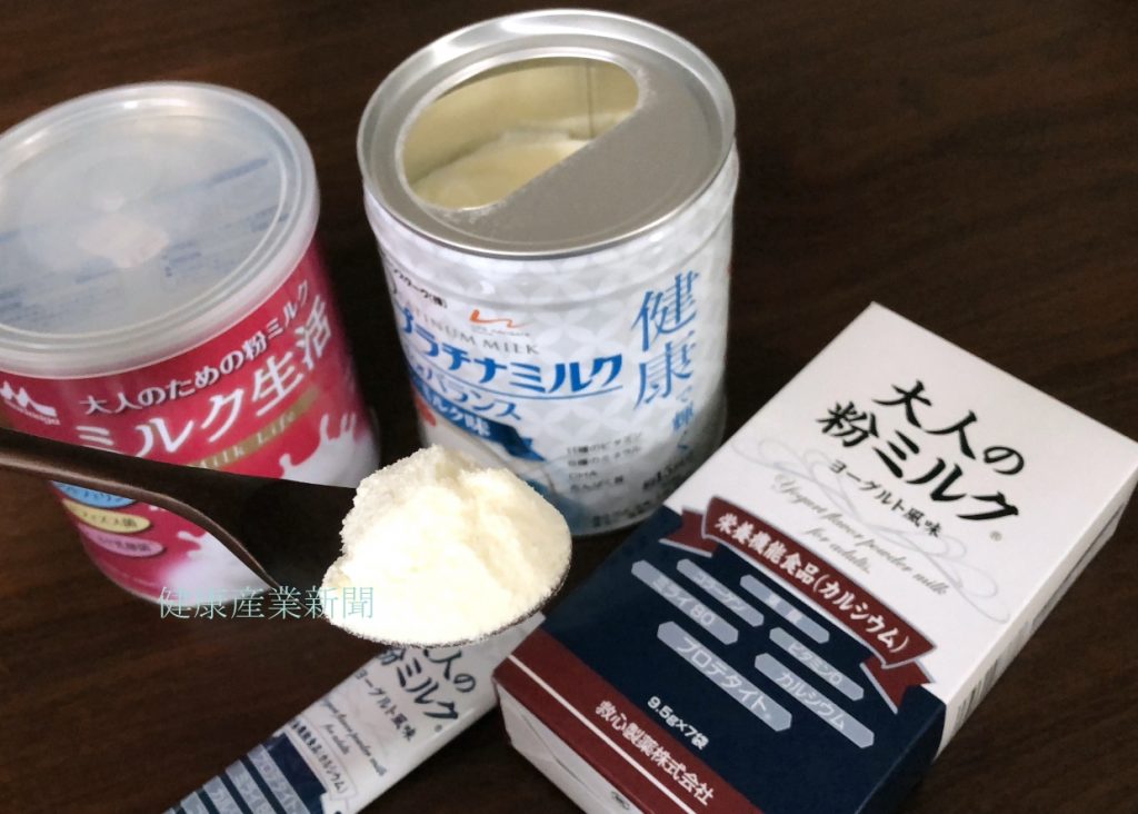 主なメーカーは救心製薬、森永乳業、雪印ビーンスターク。3社とも開発のきっかけは、「健康のために赤ちゃん用粉ミルクを飲んでいるが大人が飲んでもいい?」「骨粗しょう症予防で牛乳を飲むが、お腹がゴロゴロしてしまう」といった高齢者からの声。実は森永乳業では、以前からこの類の問い合わせが年間100件程あったという。こうした声を受け2014年4月、最初に上市されたのが救心製薬の『大人の粉ミルク』だ。牛乳の約2倍のタンパク質とカルシウムが摂取できる栄養機能食品(カルシウム)。ネーミングは「高齢者という表示は避けたかった為、当時流行していた“大人の~”というフレーズを採用した」といい、これが功を奏した。粉ミルクと大人という真逆のイメージの組み合わせからテレビやSNSで話題となり、幅広く製品を知らしめる結果となった。同社では「大々的なPRはしていないが売り上げは年々上昇。昨年度は計画比で4.7倍だった」としている。続いて、2016年に10月に森永乳業がラクトフェリンやシールド乳酸菌、“脳活”成分などを配合した『ミルク生活』を、2017年9月には雪印ビーンスタークが味にバリエーションを持たせた『プラチナミルク』シリーズを上市。いずれも当初の計画を大きく上回り、『ミルク生活』は生産が追い付かず一時注文受付を中止したほど(現在は順調)。『プラチナミルクfor バランス』は、後発ながら今年5月までの店頭売り上げシェアがトップになった。