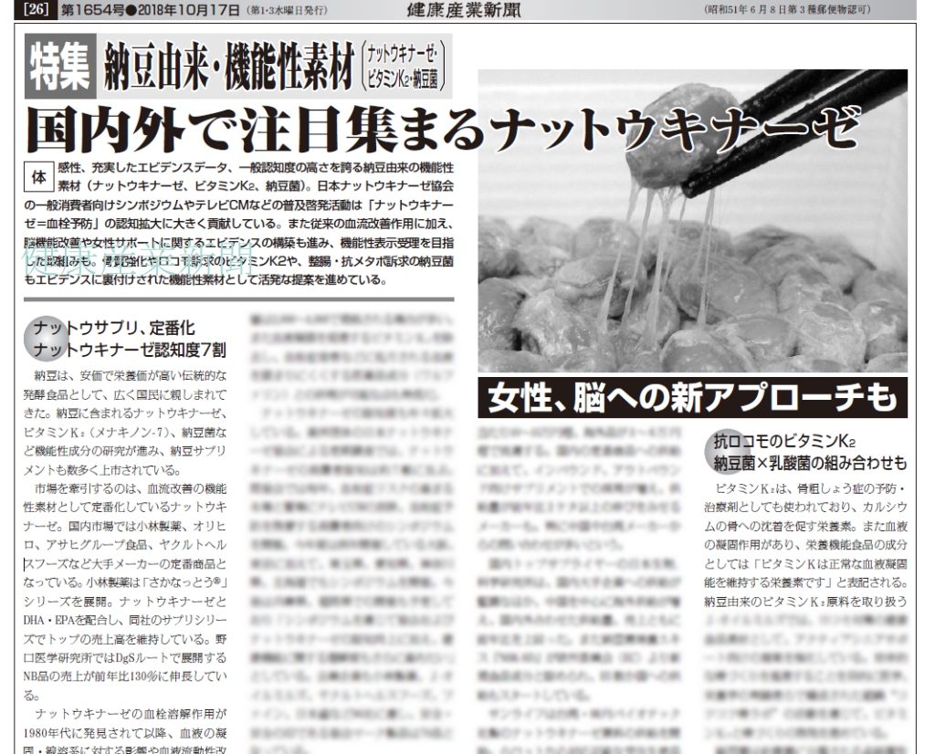 体感性、充実したエビデンスデータ、一般認知度の高さを誇る納豆由来の機能性素材(ナットウキナーゼ、ビタミンK2、納豆菌)。日本ナットウキナーゼ協会の一般消費者向けシンポジウムやテレビCMなどの普及啓発活動は「ナットウキナーゼ=血栓予防」の認知拡大に大きく貢献している。また従来の血流改善作用に加え、脳機能改善や女性サポートに関するエビデンスの構築も進み、機能性表示受理を目指した取組みも。骨質強化やロコモ訴求のビタミンK2や、整腸・抗メタボ訴求の納豆菌もエビデンスに裏付けされた機能性素材として活発な提案を進めている。