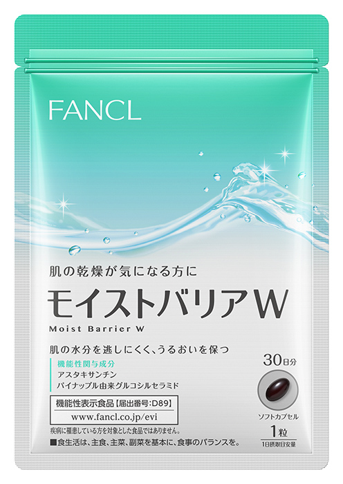 “肌の水分を逃しにくく、うるおいを保つ”をテーマにした機能性表示食品。機能性関与成分にアスタキサンチン3 mg、パイナップル由来グルコシルセラミド1,200μgを配合。サポート成分としてナノ化ヒアルロン酸も1 粒当たり50mg配合している。