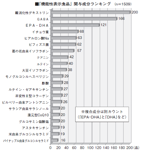 機能性表示食品の受理数が1,500品を突破した。先月14日現在、届出取り下げを除く累計数は1,509品。2017年8 月に1,000品を突破、その後も受理数を増やし、特保許可・承認数の1,063品を大きく上回っている。機能性関与成分のトップは難消化性デキストリン(グラフ)。単独での配合は200品に到達、全体の約13%に利用されている。形状別にみると、一般加工食品が51%、サプリメントが48%、生鮮食品が1 %。機能性の評価方法は研究レビューが94.3%を占めている。機能性表示は、53%が従来特保型表示(脂肪系、血圧、整腸、血糖値など)。「血糖値+中性脂肪」といった複数表示も多数受理されている。受理数トップはファインで62品。10品以上の受理があるのは32社となっている。今年度も新規表示が生まれており…
