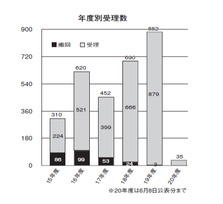 6 月8 日に届出日3 月31日分の3 品が公表され、19年度受理数は882品で確定。また同日から、届出番号の頭に「F」が付く20年度受理分の公表が始まった。2015年4月の制度スタート以降、累計数は2,989品。ここから届出取り下げ265品を除くと2,724品となる。