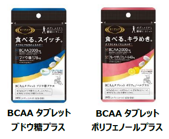 必須アミノ酸であるBCAAを1袋あたり2000㎎配合したタブレットを新発売。運動時や仕事の合間のリフレッシュなど、手軽に摂取が可能だ。BCAAに加え、エナジーサポートをするブドウ糖を配合した「ブドウ糖プラス」と、抗酸化物質の一つであるポリフェノールを配合した「ポリフェノールプラス」の2タイプを発売する。
