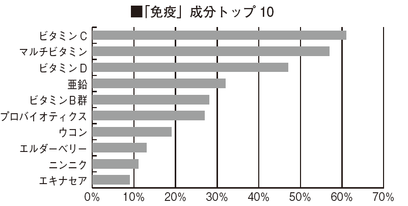 免疫のために利用されている上位3成分は、ビタミンC(61%)、マルチビタミン(57%)、ビタミンD(47%)。乳酸菌、エルダーベリーなどの他の免疫成分も、トップ10にランクインした。