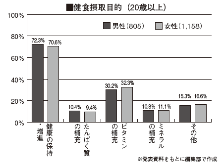 今回の国民・健康栄養調査では、錠剤やカプセル、粉末状、液状など、サプリメント剤型の健康食品について利用状況を調査。その結果、利用率は男性が30.2%、女性が38.2%だった。利用目的を複数回答で聞いた結果、男女とも「健康の保持・増進」が7割で最も多い。