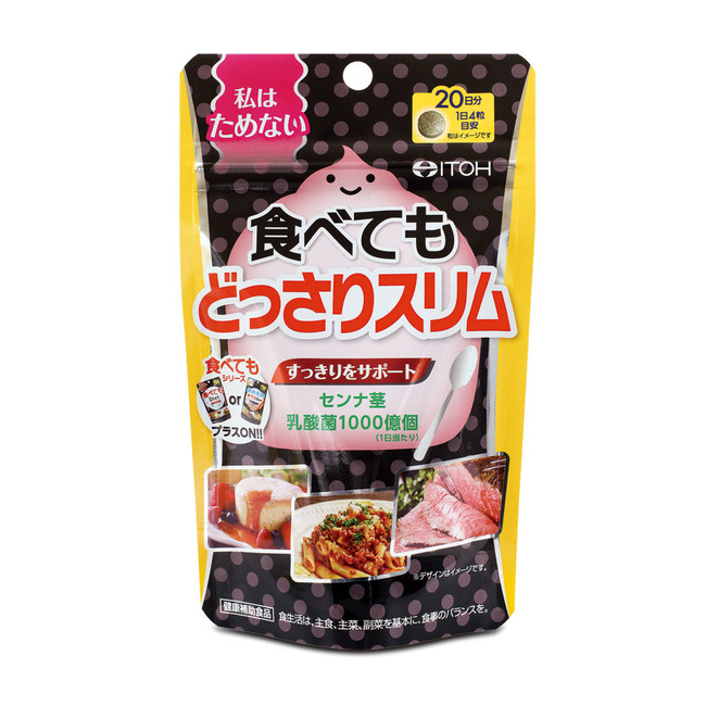 「ためたくない!」「スッキリになりたい!」という思いをサポートするために開発。1日当たりセンナ茎エキス末を400mg、乳酸菌を1000億個配合し、いつもの食事に取り入れるだけですっきり快調な毎日をサポートする。