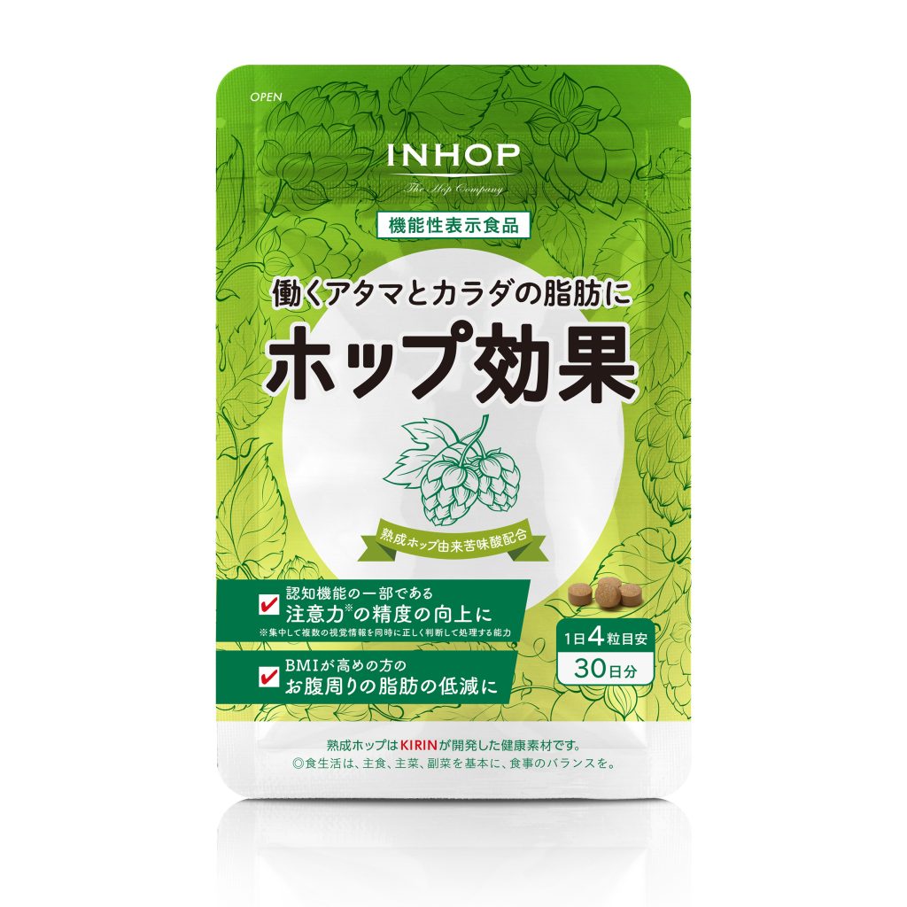■機能性表示内容: 本品には熟成ホップ由来苦味酸が含まれます。熟成ホップ由来苦味酸には、加齢により低下する認知機能の一部である注意力(集中して複数の視覚情報を同時に正しく判断して処理する能力)の精度の向上に役立つ機能が報告されています。また、熟成ホップ由来苦味酸には、BMIが高めの方のお腹周りの脂肪(体脂肪)を減らす機能があることが報告されています。