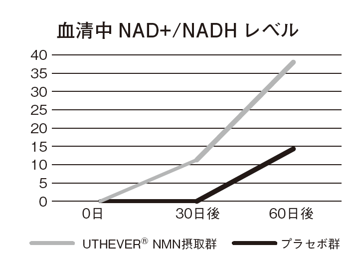 その結果、NMN群は血清中のNAD+/NADH量が30日目に初日から11.3%増加し、60日後には38.0%まで上昇した。一方、プラセボ群には有意な変化が見られなかった(グラフ)。