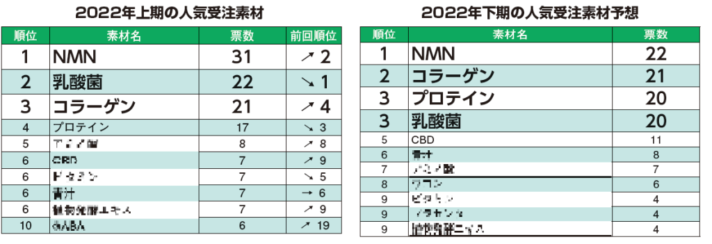 今年上期の人気受注素材で回答が寄せられた素材は約70種類。トップは「NMN」となった。一昨年調査で初めて登場したNMNは、昨年調査で2 位に大躍進。今回調査では31票を獲得しトップとなった。