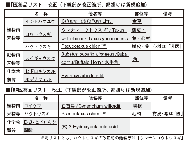 今回改正ではまた、医薬品リストに樹皮と葉、非医薬品リストに心材が収載されている「ハクトウスギ」の他名等を、ウンナンコウトウスギから「Pseudotaxuschienii」に改めた。合わせて、医薬品リストに「コウトウスギ」を新設し、他名等に「ウンナンコウトウスギ/Taxuswallichiana/Taxus yunnanensis」と記載、部位は樹皮・葉・心材とした。