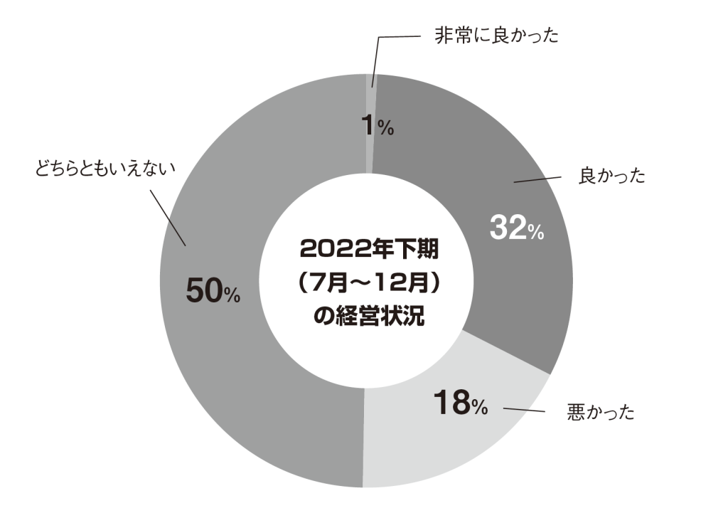 今年の売上状況は、前年調査から2ポイント増え50%が増収になった。減収企業は35%で1 ポイント改善した。今年下期の経営状況に関する質問では、前年調査と同じ33%が「良かった」と回答した。「悪かった」との回答は18%で6ポイント改善。「どちらともいえない」は半数の50%だった。