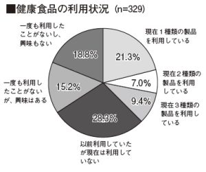 健康食品の利用状況は、「現在1種類利用」(21.3%)、「現在2 種類利用」(7.0%)、「現在3種類以上利用」(9.4%)の合計は37.7%。「以前利用していたが現在は利用していない」は28.3%で、合わせて66%に健康食品の利用経験があることがわかった。
