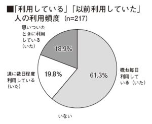 「現在利用」「以前利用」と回答した217人に利用頻度を聞いたところ、「概ね毎日利用している(いた)」が61.3%で最も多かった。「週に数日程度」は19.8%だった。利用目的を3つまで選択してもらう質問では、「栄養(ビタミン・ミネラル等)補給」が62.2%でトップ。以下、「健康維持・増進」が47.0%、「疲労回復」が22.6%、「免疫力アップ」が13.8%などと続く・・・
