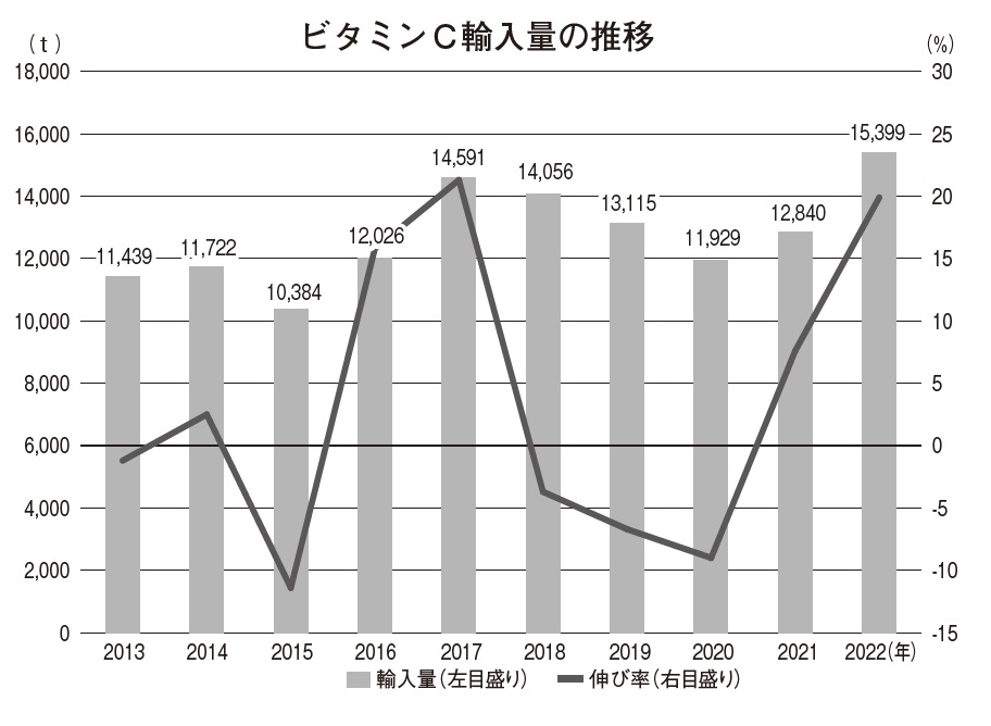 2022年のビタミンC(誘導体を含む)輸入量は1 万5,399 t で、前年比19.9 % 増。2017年に記録した1 万4,591 t を上回り、初めて1.5万t 台に乗せた。