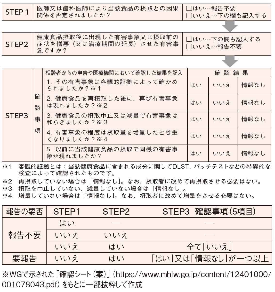 厚生労働省は、「いわゆる健康食品」との関連が疑われる健康被害情報について、製品名・成分名を伏せた上で公表を始めるとともに、より情報を収集することを目的とした検討を開始した。3月29日に、専門家WG「指定成分等含有食品等との関連が疑われる健康被害情報への対応ワーキンググループ」(座長:新潟大学大学院医歯学総合研究科血液・内分泌・代謝内科学分野教授、曽根博仁氏)を開催し、都道府県等から厚労省に報告する判断の目安となる「確認シート」や、均一な情報収集のための「報告フォーマット」等について議論。今後、自治体や業界団体から意見を聞き、改めてWGで検討を行い、必要に応じ、2002年10月の通知「健康食品・無承認無許可医薬品健康被害防止対応要領」を改正する。