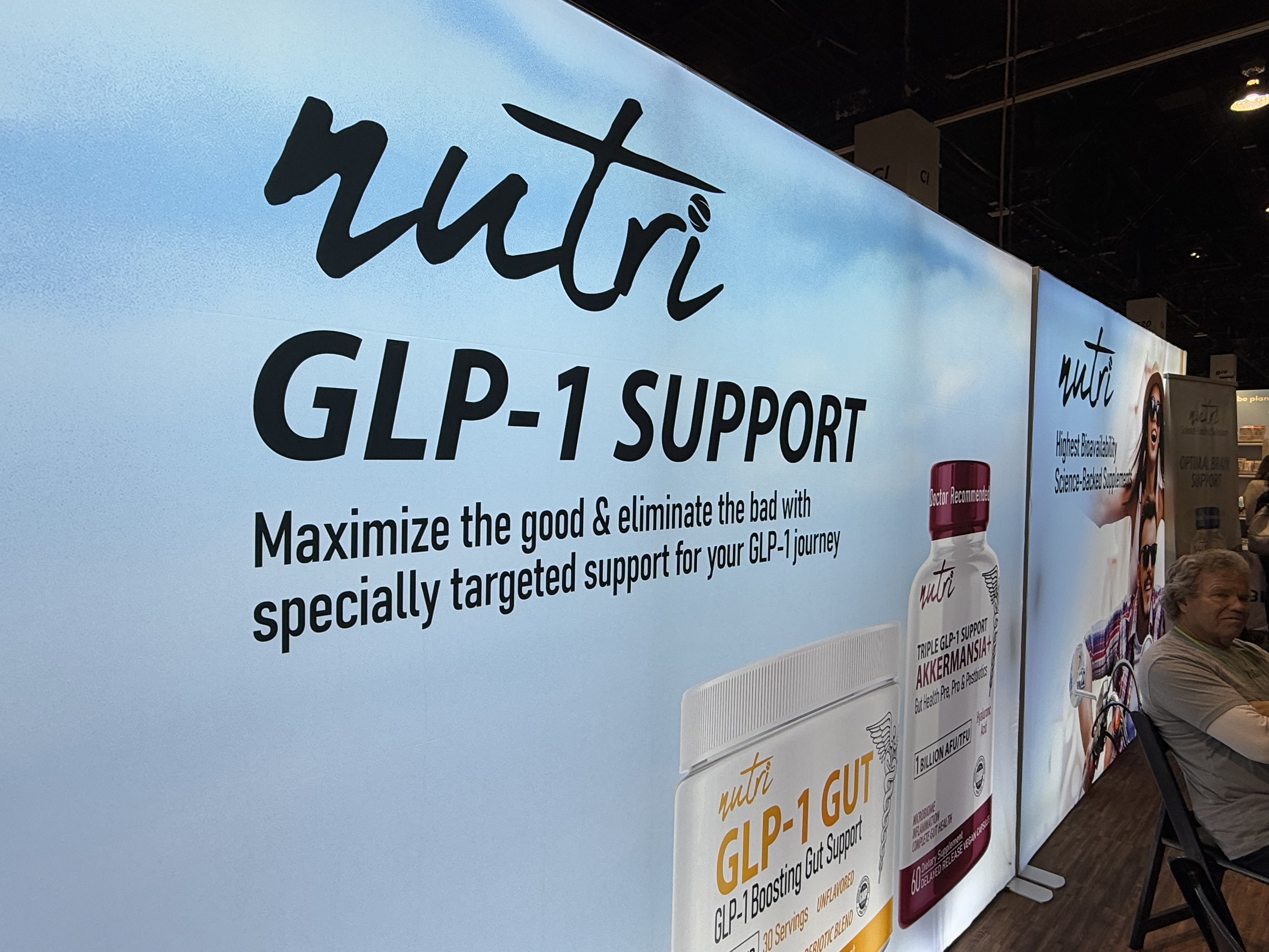 テーマ別では「GLP-1」をターゲットにしたダイエット・血糖値対策サプリの出品が目立った。GLP-1は血糖値を下げるホルモンで、サプリの摂取によりGLP-1の分泌を促す。Nutri社は複数種類のプレバイオティクス(食物繊維)を配合した「GLP-1 GUT」や、プロバイオティクス、ポストバイオティクス、アッカーマンシア菌を配合した「GLP-1 COMPLEX」を展示。GLP-1のブーストに加え腸の健康を維持する設計となっている。