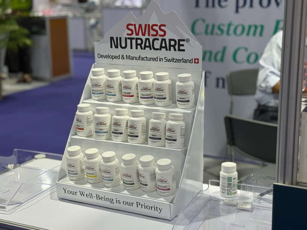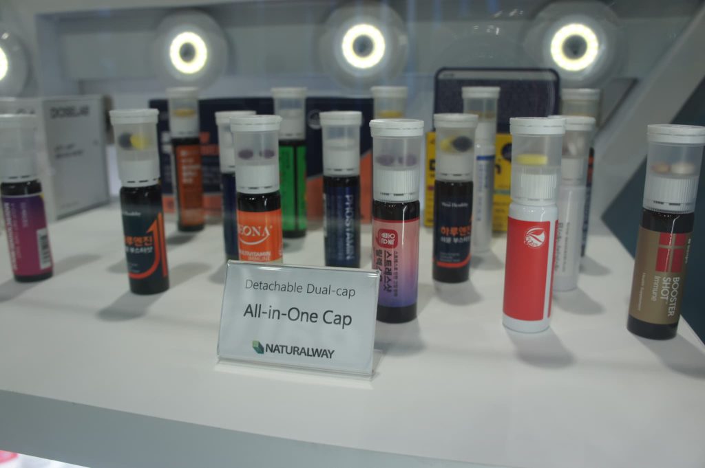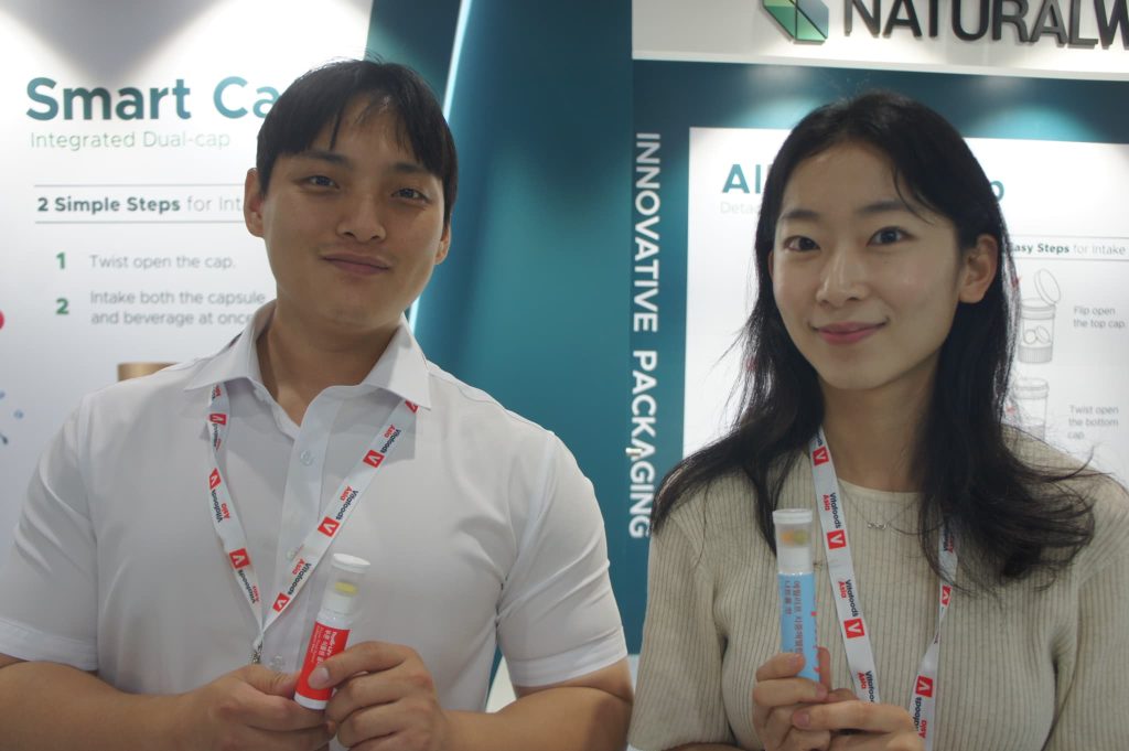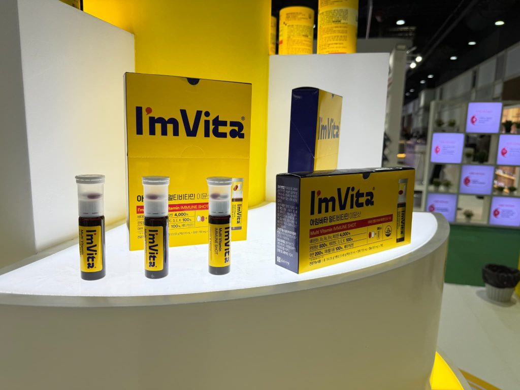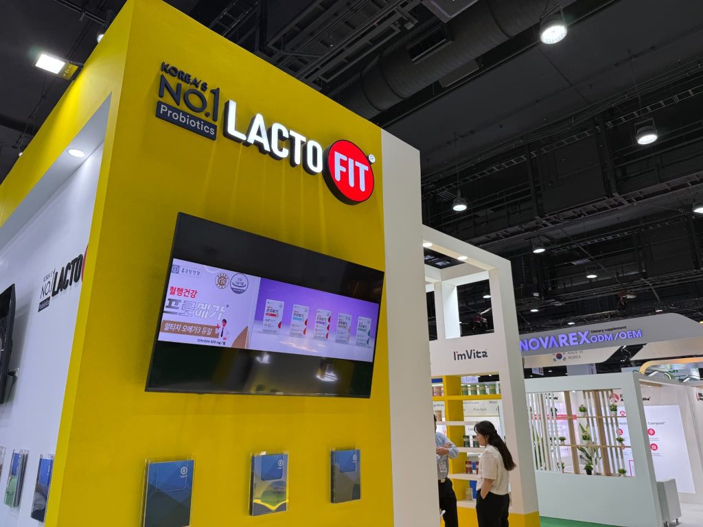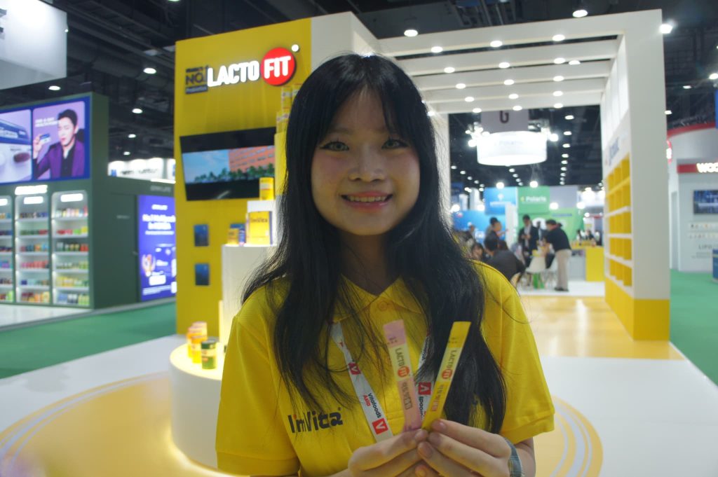 韓国チョングンダン ヘルスケアは主力製品の「LACTO FIT」に加え、錠剤と液剤を一つの容器に入れた「I’mVita」をアピール。