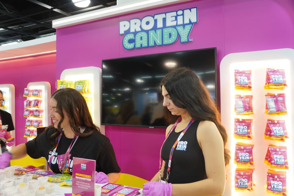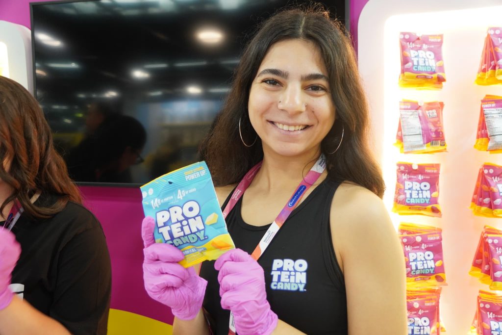 プロテイン製品は会場のあちこちで展示されており、粉末タイプからバー食品、飲料(RTD)やキャンディなど、幅広い剤型が並ぶ。どのメーカーもタンパク含有量の多さをアピールしている。