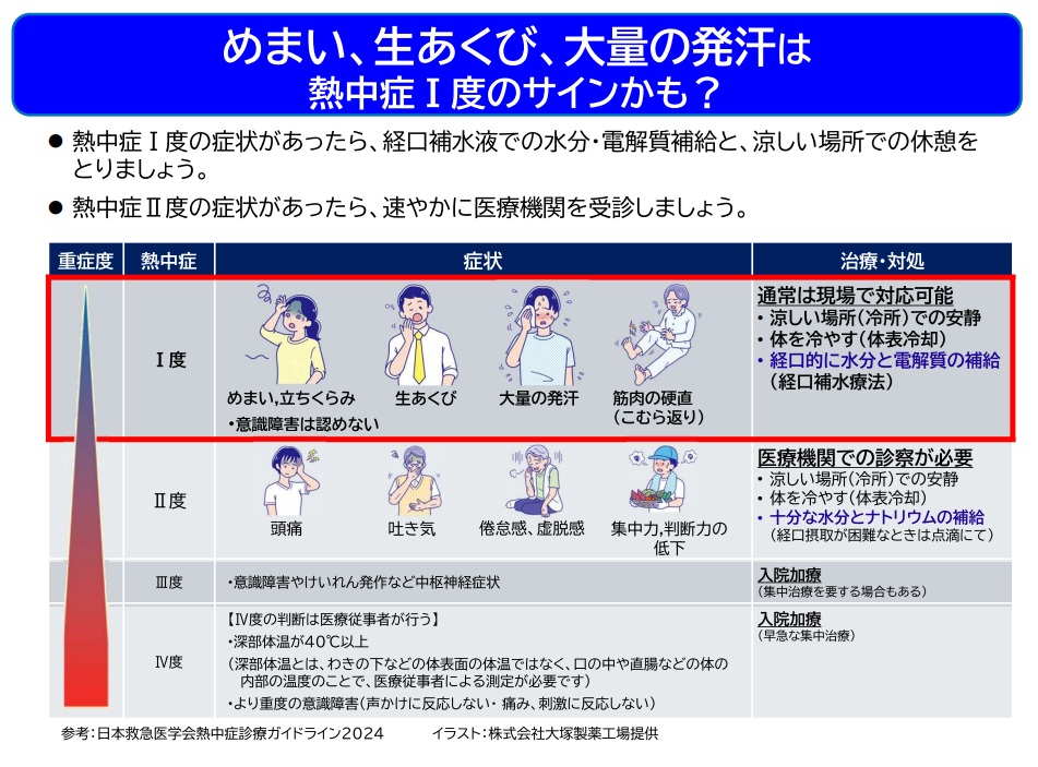 会見では、熱中症の専門家として日本医科大学大学院医学研究科教授で、同大学付属病院高度救命救急センター部長の横堀將司氏が登壇。熱中症予防の根底として「まずは暑熱環境からから避難すること。エアコンなどを使用し、体温を下げるなどの工夫も必要。さらに、適切な水分を適切なタイミングで摂取することが重要」と解説した。経口補水液の摂取タイミングについては、日本救急医学会熱中症診療ガイドラインで設定している「熱中症Ⅰ度」の症状が現れた際に飲用するのが適切とし、症状としては「めまい、立ちくらみ」「生あくび」「大量の発汗」「筋肉の硬直(こむら返り)」が目安という。同氏は「経口補水液は予防的に飲用するものではなく、症状が出た際に摂取するもの」とし、続けて「ガイドラインのⅡ度以上(頭痛、吐き気、集中力・判断力の低下)に該当する場合は、医療機関での診察が必要であり、自分で水分が摂れない場合は無理に飲ませずに点滴による対処をするように」と説明した。