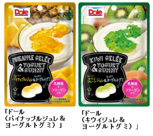 乳酸菌と1 袋あたり1,000mgのコラーゲンを配合した、「ドール」ブランドのグミ。味はパイナップルジュレ&ヨーグルトとキウイジュレ&ヨーグルトの2 種類を用意した。ジューシーなジュレとヨーグルト味のもっちりしたグミの2 層構造となっている。