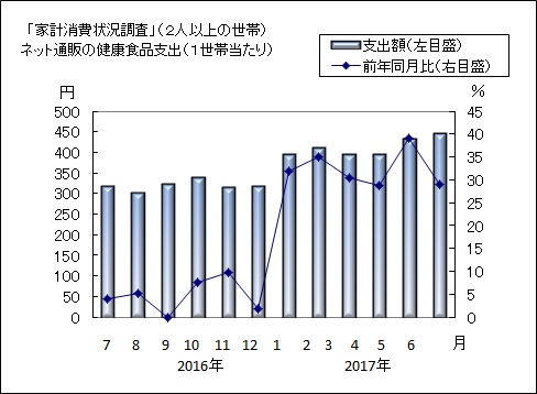 アマゾンの台頭などを背景に拡大を続けるインターネット通販。その成長スピードがさらに加速している。総務省統計局が2015年1月分から詳細調査を開始した統計結果で、2017年上半期における健康食品ネット通販支出額が前年同期比32%増と飛躍的に伸びたことがわかった。「健康産業速報」本日配信号で詳細を報じる。