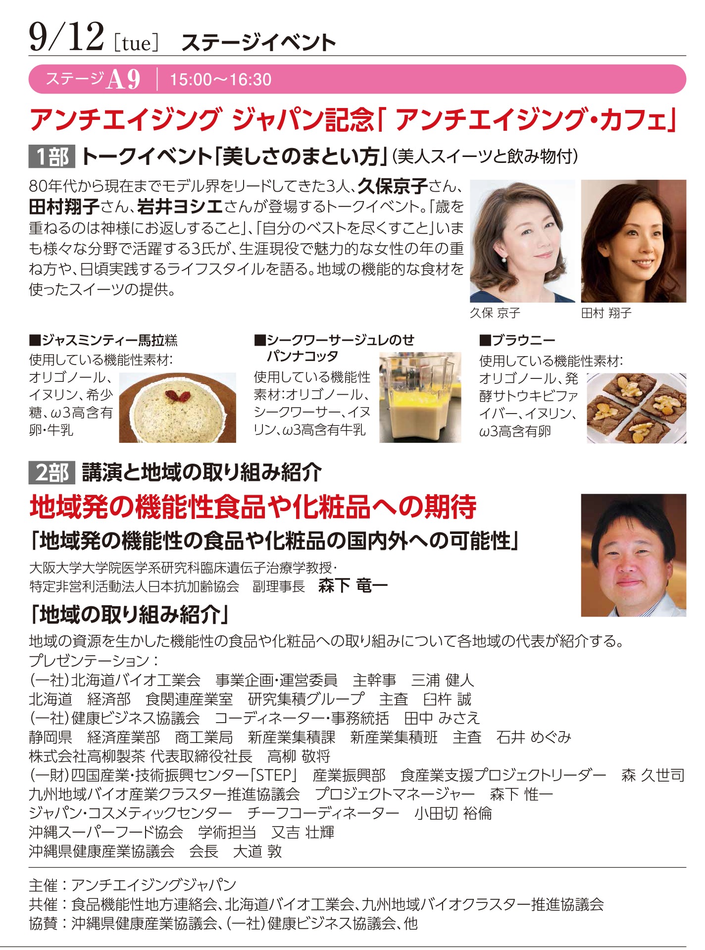 開催2日目、9月12日(15:00~16:30、イベントステージ)には、業界初の地域連携イベントとして「アンチエイジング カフェ」(※)が開催される。第1部は、アンチエイジングトークショー。80年代からモデルシーンをリードしてきた久保京子さん、田村翔子さん、岩井ヨシエさんが、いつまでも若々しく魅力的な歳の重ね方や、心掛けているヘルシーなライフスタイルについて語る。協賛各地提供の機能性素材で作った「美人スイーツ」(日本抗加齢協会理事長代行森下竜一氏レシピ監修)も提供される。そして、第2部では、森下氏が「機能性の食品や化粧品の可能性」について講演。引き続き、各地域の代表が機能性素材の商品化や制度への取り組みを紹介する(上記プログラム参照)。地域発の美と健康が動き出した。尚、同日は、地域発の美容食品や化粧品の「第3回ジャパンメイド・ビューティ アワード」の授賞式(13:10~)も開催される。
