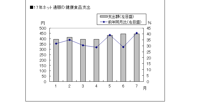 総務省統計局は5日、「家計消費状況調査」の7月分結果を公表、健康食品のインターネット通販支出額は前年同月の4割増となった。