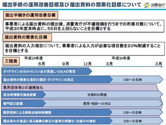 消費者庁は27日までに、機能性表示食品制度の運用改善目標などを示すとともに、実現に向けた「工程表」を明らかにした。不備指摘を行うまでの所要日数は「55日を上回らないこと」を目標とする。Q&A、ガイドラインの公表時期も見えてきた。