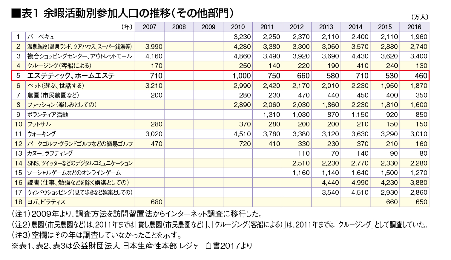 「レジャー白書2017」(生産性本部)では、エステティック(ホームエステ含む)への参加人口は、2010年の1,000万人をピークに年々減少し、ついに2016年には460万人と半減(表1参照)していることが分かった。当然参加率も、2010年17.3%から減少し現在は8.1%と振るわない。生産性本部余暇創研への取材では、実際の参加率は108の種目中、全世代女性では47位。年代別で見ると、かろうじて女性20代が28位、コアターゲット層の30代40代でも30位にさえ入っていない。その一方で、「潜在需要(希望率ー参加率)」は、女性全体で、国内旅行、クルージング、ヨガ・ピラティス、温浴施設に次いで堂々の6位にランクイン。上位の常連だ。年代別でも10代から60代までで必ず10位以内をキープしている。つまり、憧れや希望はあっても実際の利用に結びついていないということだ。その高いハードルは、そもそも「美」への行動ならではの特性かもしれない。もしくは、そのせっかくの大きなニーズを、しっかりと受けとめきれないサービス提供側の深刻な課題があるのかもしれない。