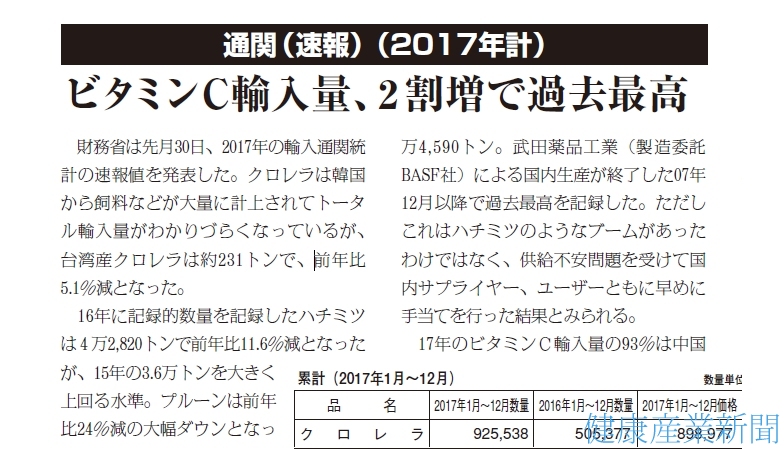 17年のビタミンC輸入量の93%は中国からのもの。その中国では政府の厳しい排煙・排水規制により、工場閉鎖に追い込まれたところもある。その後、計画生産にシフトし需給バランスや相場の安定