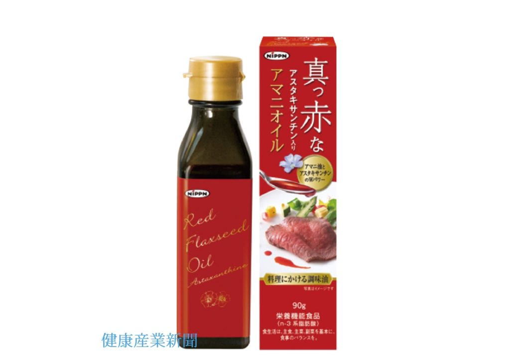 料理にかけることで食卓を鮮やかに彩る、新感覚の調味オイル。インパクトのある鮮やかな赤色、おいしさ、そして健康の3つをテーマに開発した。「n-3系脂肪酸は、皮膚の健康維持を助ける栄養素です」と表示(栄養機能食品)。1日当たりの摂取目安量は3.0gで、α-リノレン酸1.9g、アスタキサンチン2.0mgが摂取可能となっている