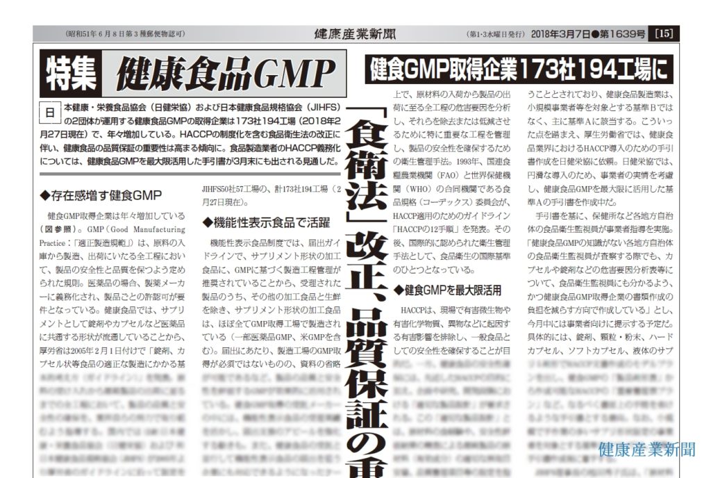 日本健康・栄養食品協会(日健栄協)および日本健康食品規格協会(JIHFS)の2団体が運用する健康食品GMPの取得企業は173社194工場(2018年2月27日現在)で、年々増加している。HACCPの制度化を含む食品衛生法の改正に伴い、健康食品の品質保証の重要性は高まる傾向に。食品製造業者のHACCP義務化については、健康食品GMPを最大限活用した手引書が3月末にも出される見通しだ。