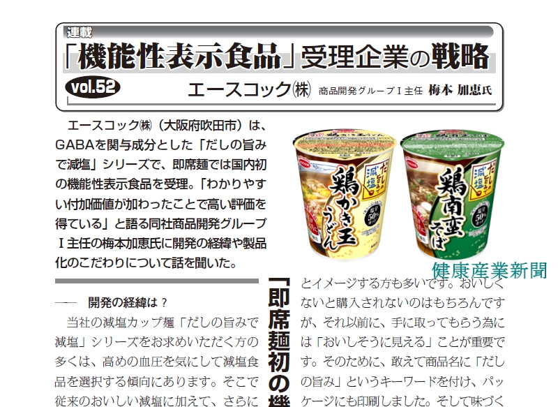 エースコック(株)は、GABAを関与成分とした「だしの旨みで減塩」シリーズで、即席麺では国内初の機能性表示食品を受理。「わかりやすい付加価値が加わったことで高い評価を得ている」と語る同社商品開発グループⅠ主任の梅本加恵氏に開発の経緯や製品化のこだわりについて話を聞いた。