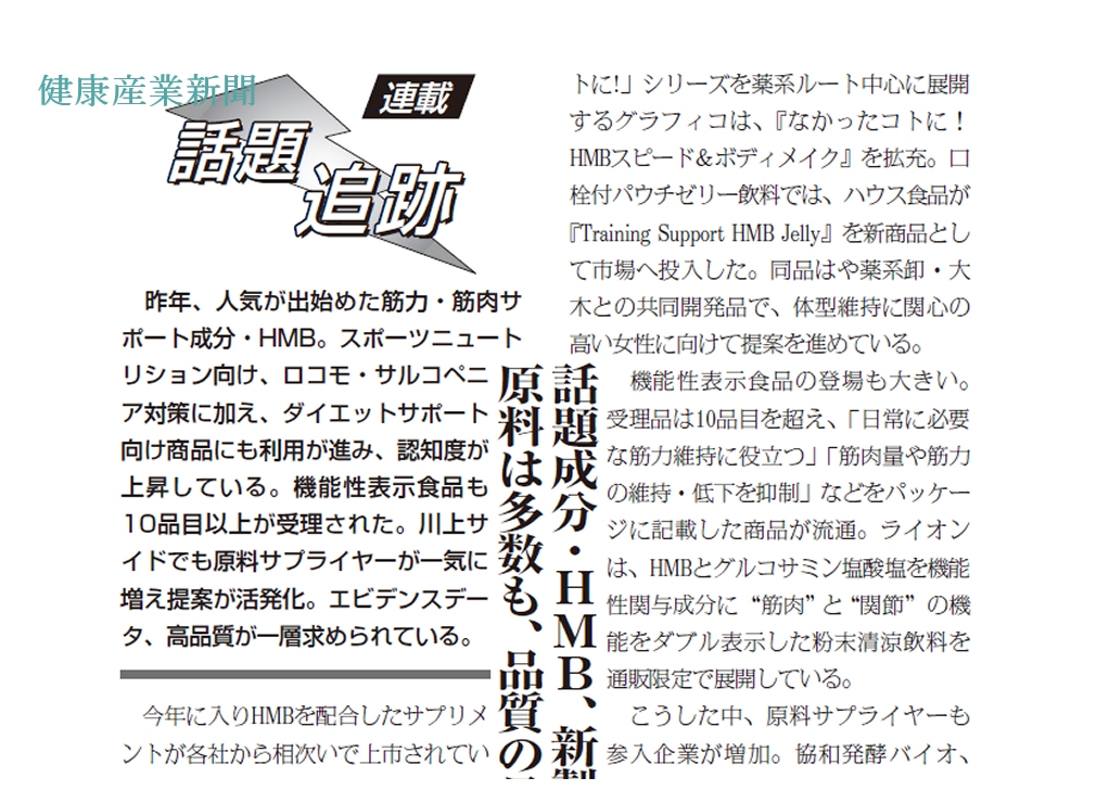 昨年、人気が出始めた筋力・筋肉サポート成分・HMB。スポーツニュートリション向け、ロコモ・サルコペニア対策に加え、ダイエットサポート向け商品にも利用が進み、認知度が上昇している。機能性表示食品も10品目以上が受理された。川上サイドでも原料サプライヤーが一気に増え提案が活発化。エビデンスデータ、高品質が一層求められている。