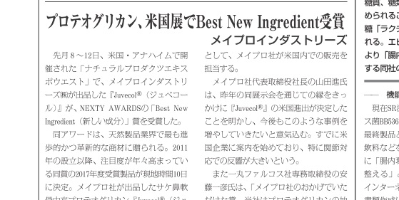 先月 8 ~12日、米国・アナハイムで開催された「ナチュラルプロダクツエキスポウエスト」で、メイプロインダストリーズ㈱が出品した『Juvecol®(ジュベコール)』が、NEXTY AWARDSの「Best New Ingredient(新し…