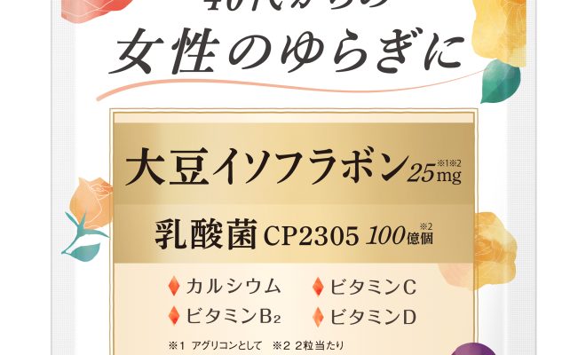 2粒当たりに大豆イソフラボン25mg、『乳酸菌CP2305』 100億個、カルシウムに各種ビタミンを配合。シトラスミックスの香りの粒状サプリメント。40代~50代のゆらぎ世代の女性向けに提案をしている。内容量・価格/1袋(60粒)・…