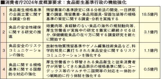 消費者庁 24年度概算要求 食品衛生基準行政の機能強化 保健機能食品で新たな調査研究も