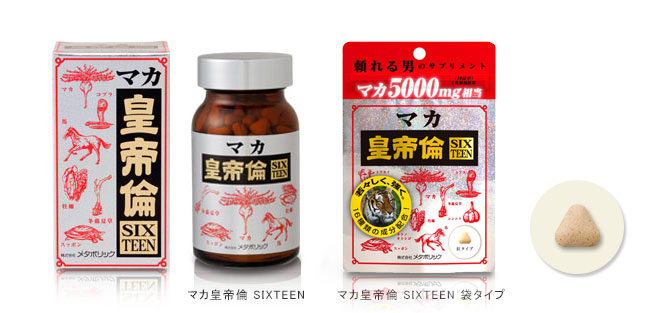 同品は、発売17年目を迎えた活力系サプリメント『マカ皇帝倫SIXTEEN』のアルミチャック袋タイプ。1 日分としてマカエキス末を250mg含有しており、乾燥粉末に換算すると5,000mgに相当する。このほか、スッポン、冬虫夏草、カキ肉エキス…