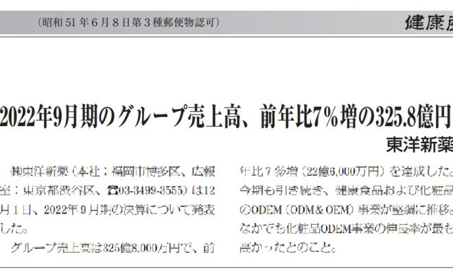 ㈱東洋新薬(本社:福岡市博多区、広報室:東京都渋谷区)は12月1 日、2022年9 月期の決算について発表した。グループ売上高は325億8,000万円で、前年比7 %増(22億6,000万円)を達成した。今期も引き続き、健康食品および化粧品…
