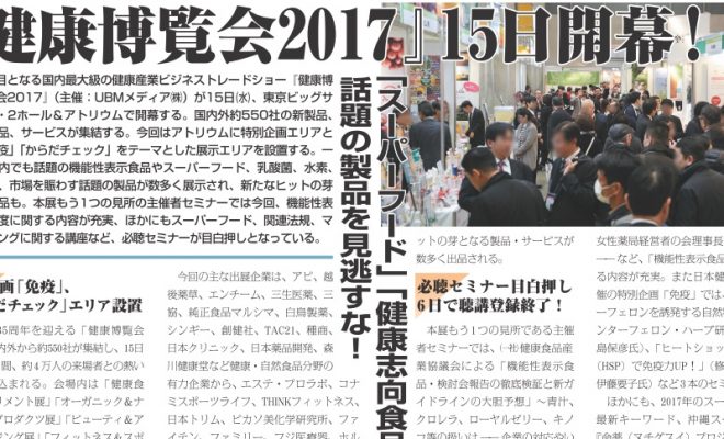35回目となる国内最大級の健康産業ビジネストレードショー『健康博覧会2017』(主催:UBMメディア㈱)が15日(水)、東京ビッグサイト西1・2ホール&アトリウムで開幕する。国内外約550社の新製品、売れ筋製品、サービスが集結する。今回はア…