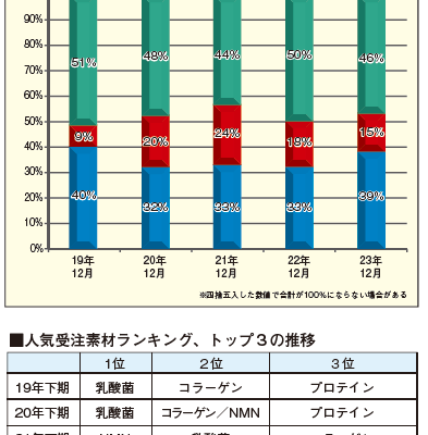 本紙恒例の健康食品受託企業調査で、2023年に増収となった企業は55%で、前年の50%を上回ったことがわかった。過去最多となる138社が回答した。「経営良好」の割合は39%で、コロナ1年目の20年調査から持ち直している。人気受注素材の1位は…