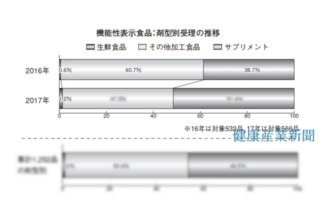 機能性表示食品で錠剤やカプセル等のサプリメント剤型の受理が増えていることが、本紙の集計でわかった。「届出日」別で2017年の暦年データが出揃い、集計したところ、17年の受理総数は576品で、前年比2.9%増。集計時に撤回済みの品目を除くと、…