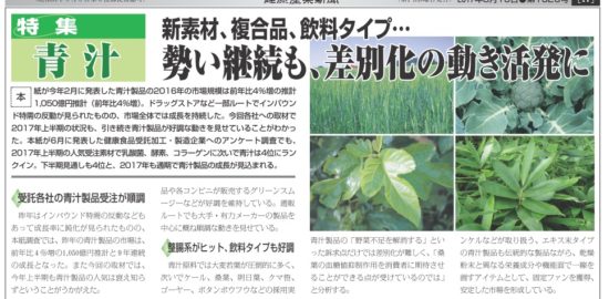 本紙が今年2月に発表した青汁製品の2016年の市場規模は前年比4%増の推計1,050億円推計(前年比…