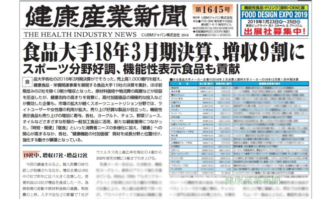食品大手18年3月期決算、増収9割に -スポーツ分野好調、機能性表示食品も貢献-