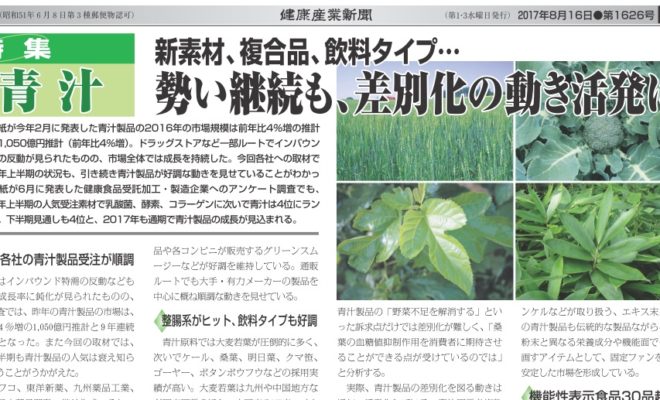 本紙が今年2月に発表した青汁製品の2016年の市場規模は前年比4%増の推計1,050億円推計(前年比4%増)。ドラッグストアなど一部ルートでインバウンド特需の反動が見られたものの、市場全体では成長を持続した。今回各社への取材で2017年上半…