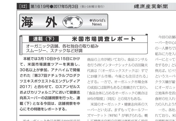 本紙では3月10日から15日にかけて、米国市場調査ツアーを実施し、30名以上が参加。アナハイムで開催された『第37回ナチュラルプロダクツエキスポウエスト&エングレディア2017』と合わせて、ロスアンゼルスおよびカリフォルニアにおいて…