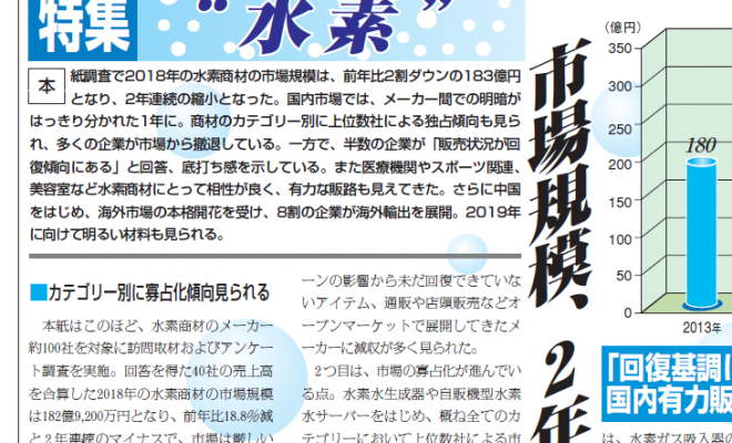 本紙調査で2018年の水素商材の市場規模は、前年比2割ダウンの183億円となり、2年連続の縮小となった。国内市場では、メーカー間での明暗がはっきり分かれた1年に。商材のカテゴリー別に上位数社による独占傾向も見られ、多くの企業が市場から撤退し…