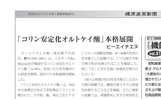 ビ ーエイチエヌ ㈱ (東京都千代田区、 03-5281-5661)は、ベルギーのBioMinerals社が製造するコリン安定化オルトケイ酸「ch-OSA」を用いた日本市場向けの剤型を開発、国内での本格展開を開始した。「コリ…