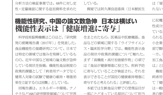 機能性表示は「健康増進に寄与」科学技術振興機構はこのほど、「研究開発の俯瞰報告書(2017年)」を発表した。食品機能性の基礎研究について、日本では特定の領域では強みを発揮しているものの、近年中国など地域の論文数が急伸している現状を指摘。…